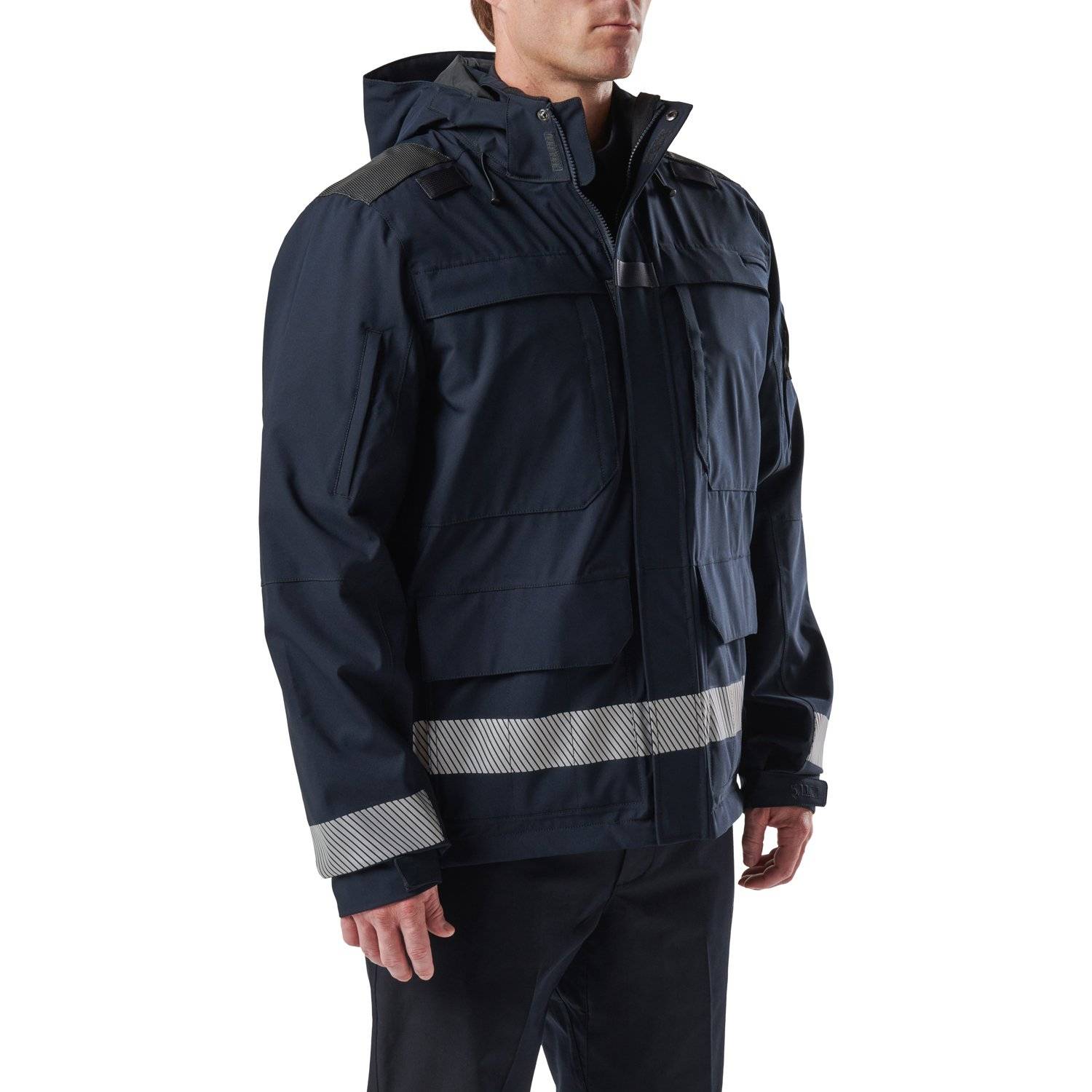 Stay warm with the fully seam-sealed, waterproof 5.11 Responder Parka 2.0. This tactical jacket has a 10K/10K waterproof/breathable and bloodborne pathogen resistant rating packed into a 2L hardshell fabric. There are many pockets at the chest and sleeves to keep your gear within reach, plus mic/camera loops, loop platforms, and a storable hood for convenience. For extra safety, this waterproof jacket has 3M® Scotchlite® reflective tape on the bottom, around the sleeves, and at the back for greater visibility to others. Additionally, this reflective jacket features 5.11’s Quixip technology on the side seams for quick firearm access and ventilation.