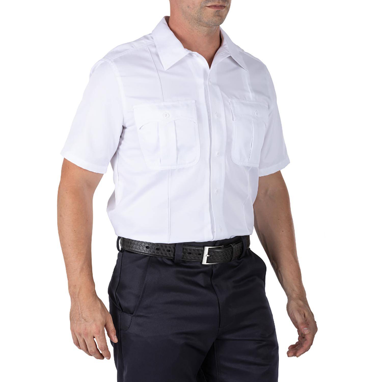 The 5.11 Men's Class A Fast-Tac Twill Short Sleeve Shirt is crafted for duty and made from lightweight and water-resistant Fast-Tac® Twill. It's designed with mic loop openings on the side seams, dual chest pockets with pen guides, and a convenient center front zip closure. This shirt includes epauletts, a badge tab, a camera/radio loop, and a name badge support strip, all neatly separated in a polybag. The stitched creases at the front and back ensure a professional appearance, making it ideal for station or street duty.