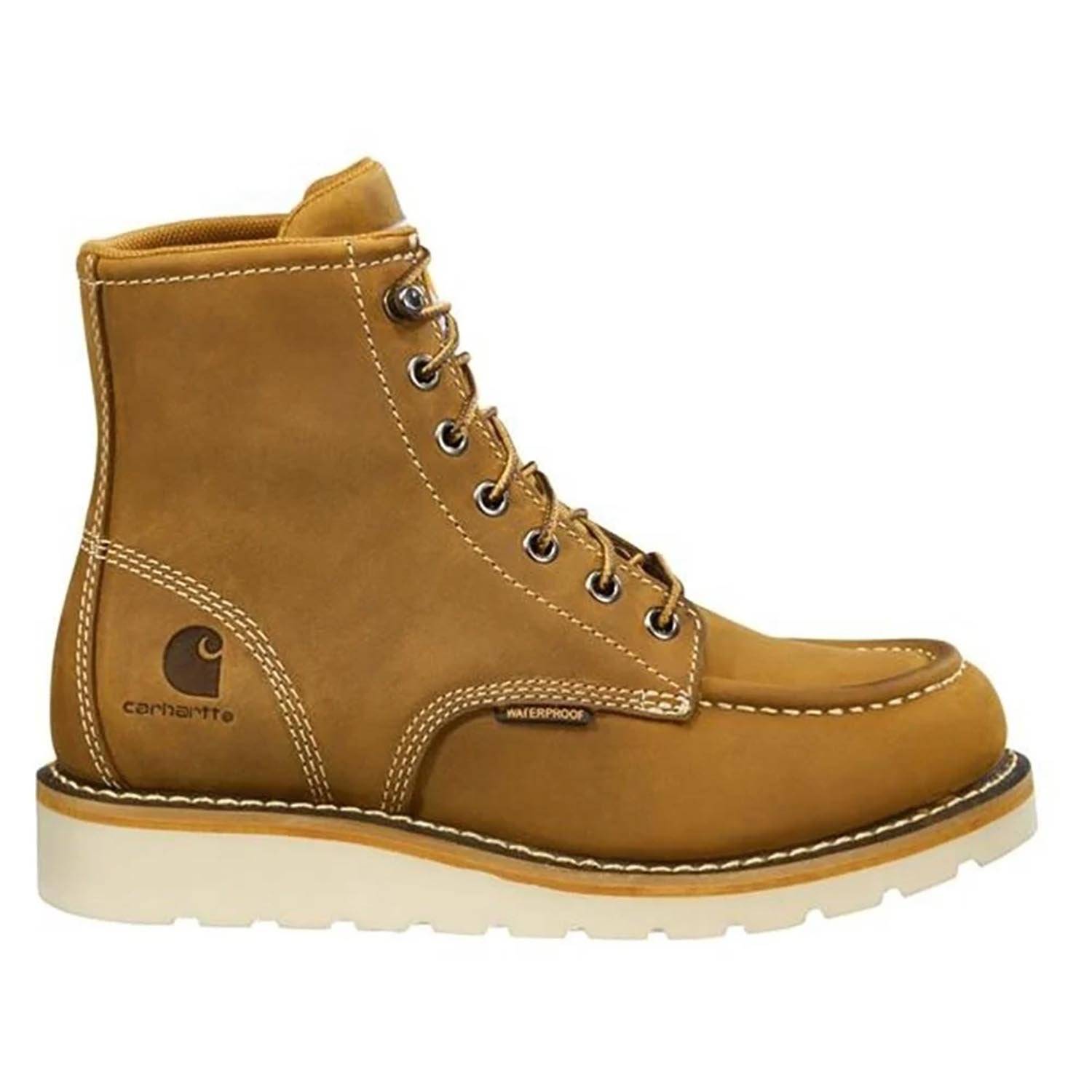 Redefining the standards of safety and comfort, the Carhartt Women's Waterproof 6" Moc Steel Toe Wedge Work Boot is designed for hard-working women. These boots are constructed with robust, oil-tanned leather to resist daily wear and tear and feature a steel toe for enhanced safety. Built to withstand tough job sites; they meet the ASTM 2413-18 standards for impact and compression hazards. The boots also offer secondary protection against incidental contact with 18,000 volts or less electrical circuits under dry conditions. Designed for all-day wear, the boots incorporate a Storm Defender waterproof breathable membrane that permits ventilation while keeping your feet dry. The FastDry technology lining wicks away sweat, ensuring a dry and comfortable environment for your feet. The dual-density rubber outsole and Goodyear welt construction add to the durability and longevity of these boots.