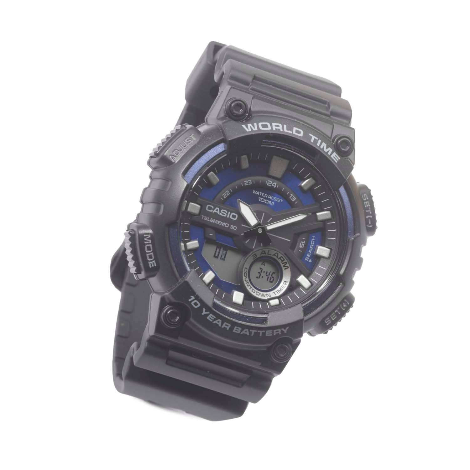 Perfect for almost any outdoor outing, the Casio Black Resin Sports Watch utilizes a 10-year battery and provides plenty of functionality. This sporty analog/digital combination model features 30-city world time, 3 daily alarms, a stopwatch and dual countdown timers, making this a highly versatile timepiece.