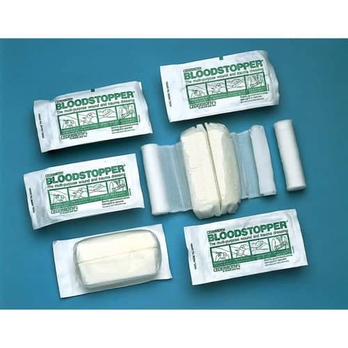 The Cederroth Bloodstopper™ can stop severe bleeding and protect almost all types of wounds. The unique pressure roll and elastic wrap allow the Bloodstopper to stop severe bleeding to the head, trunk and/or limbs. Unfolded, the Bloodstopper can be used as a cover dressing for burns and abrasions; as a sling to stabilize dislocated shoulders or to splint broken limbs; and as a postpartum dressing for field deliveries. Packaged sterile in an easy-to-open peel back wrapper that allows the product to be removed without touching and contaminating the wound pad area.