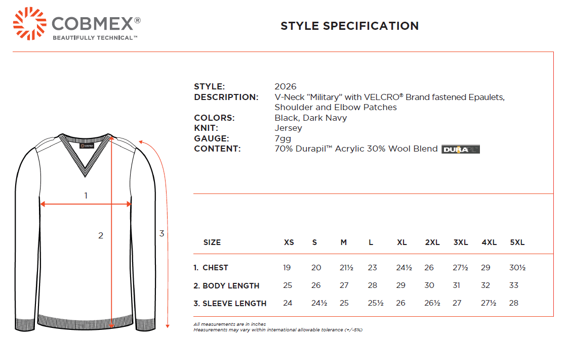 The Cobmex Unisex V-Neck "Military" Sweater with VELCRO Epaulets, Shoulder & Elbow Patches is designed for durability and performance, made with a 70% Durapil™ Acrylic and 30% Wool blend. Ribbed cuffs and a waistband ensure a comfortable fit for all-day wear. Combining functionality with a polished look, this sweater maintains a professional appearance in any setting. A trusted choice among law enforcement, EMTs, and fire services, it delivers reliability and style on the job.