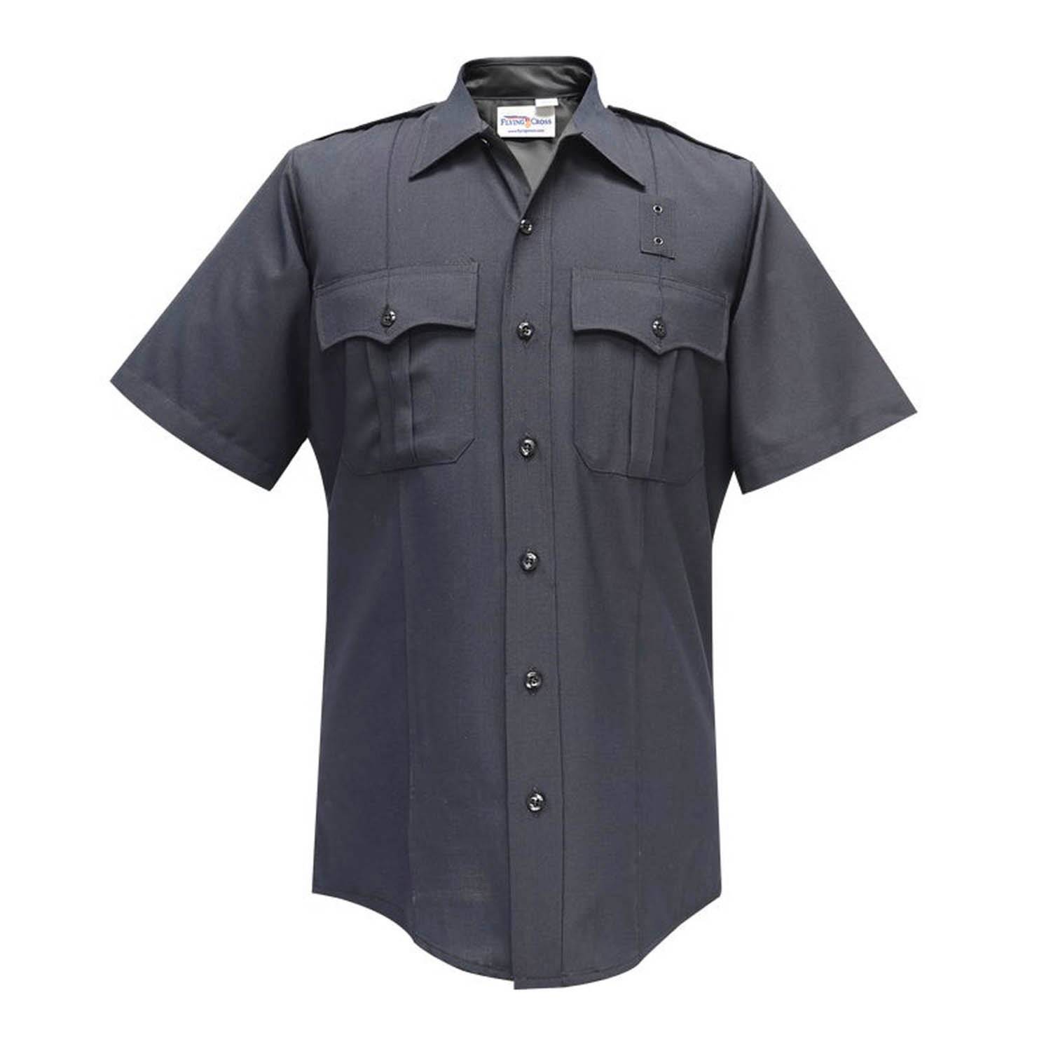 The Flying Cross Men's Justice 75% Poly / 25% Wool Short Sleeve Shirt features a seven-button design for a classic, traditional appearance. It is machine washable and comes with a conventional collar, band, and collar stays for easy maintenance. The shirt includes pleated front pockets with VELCRO® Brand closures, scalloped flaps, a hidden pencil compartment, and a metal eyelet badge holder. Additional details include five military creases and a high-luster twill lining on the yoke and collar for a polished finish.