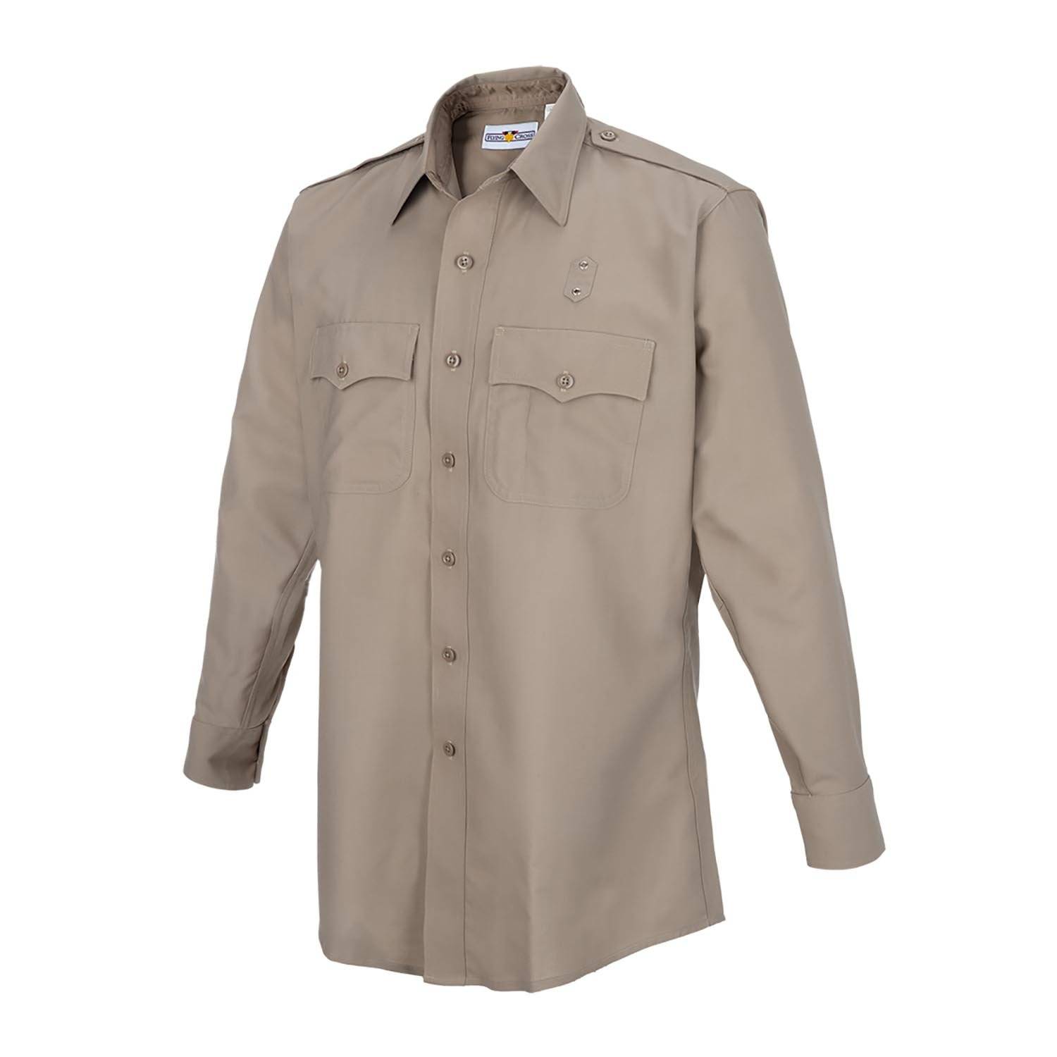 The Flying Cross Men's LASD Deputy Sheriff Class A Long Sleeve Shirt combines the strength of polyester with the natural comfort of wool for year-round wear. This durable blend offers breathable heat release in warm weather and thermal-like insulation in the cold. It features Supercrease® military-style creases, pleated pockets with scalloped flaps, and a high-luster twill finish for a professional appearance. Additional details include a metal eyelet badge holder and optional hidden front zipper for a clean, polished look.