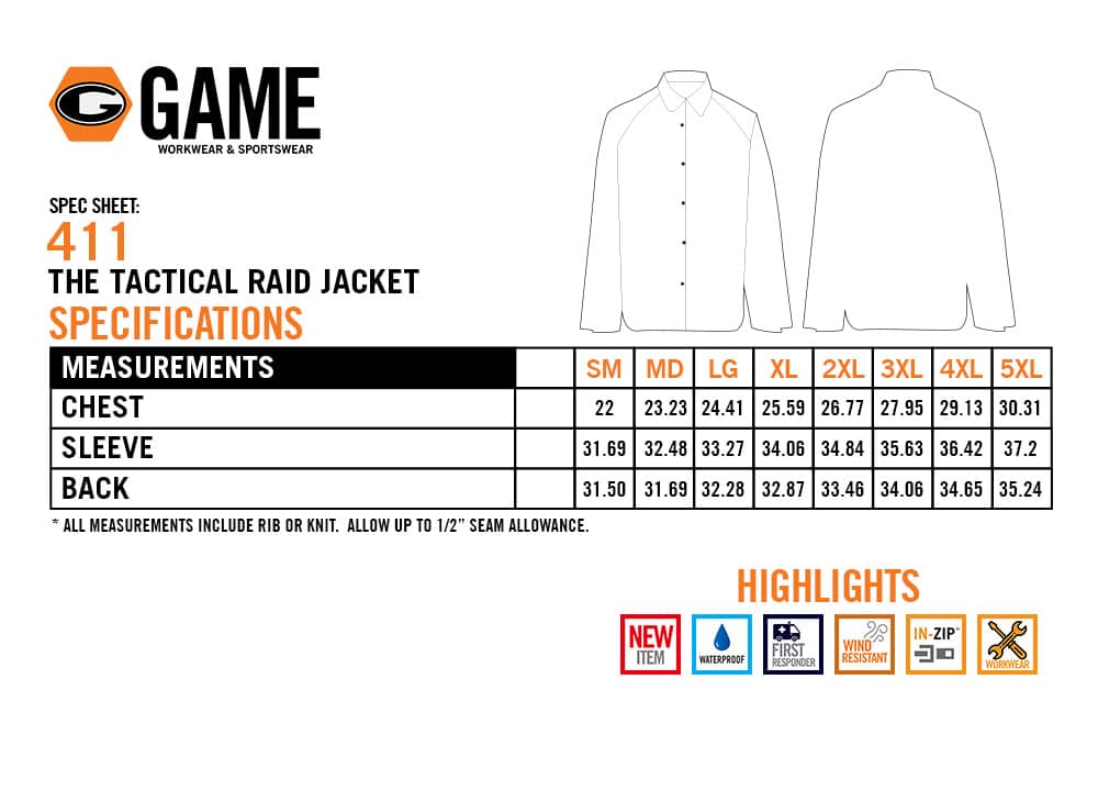 The Game Tactical Raid Jacket offers superior waterproof protection and functional versatility for law enforcement and tactical operators. Constructed from 150-denier 100% TPU polyester oxford ripstop with sealed seams, itUs built to block wind and moisture in any condition. The raglan sleeve design enhances mobility, while side seam zippers provide comfortable access to duty belts and gear. With sealed front slash pockets, two hidden inner tactical pockets, and adjustable wrist closures, this jacket balances practicality with professional appearance. The Back In-Zip system allows quick access for customization or identification panel placement.