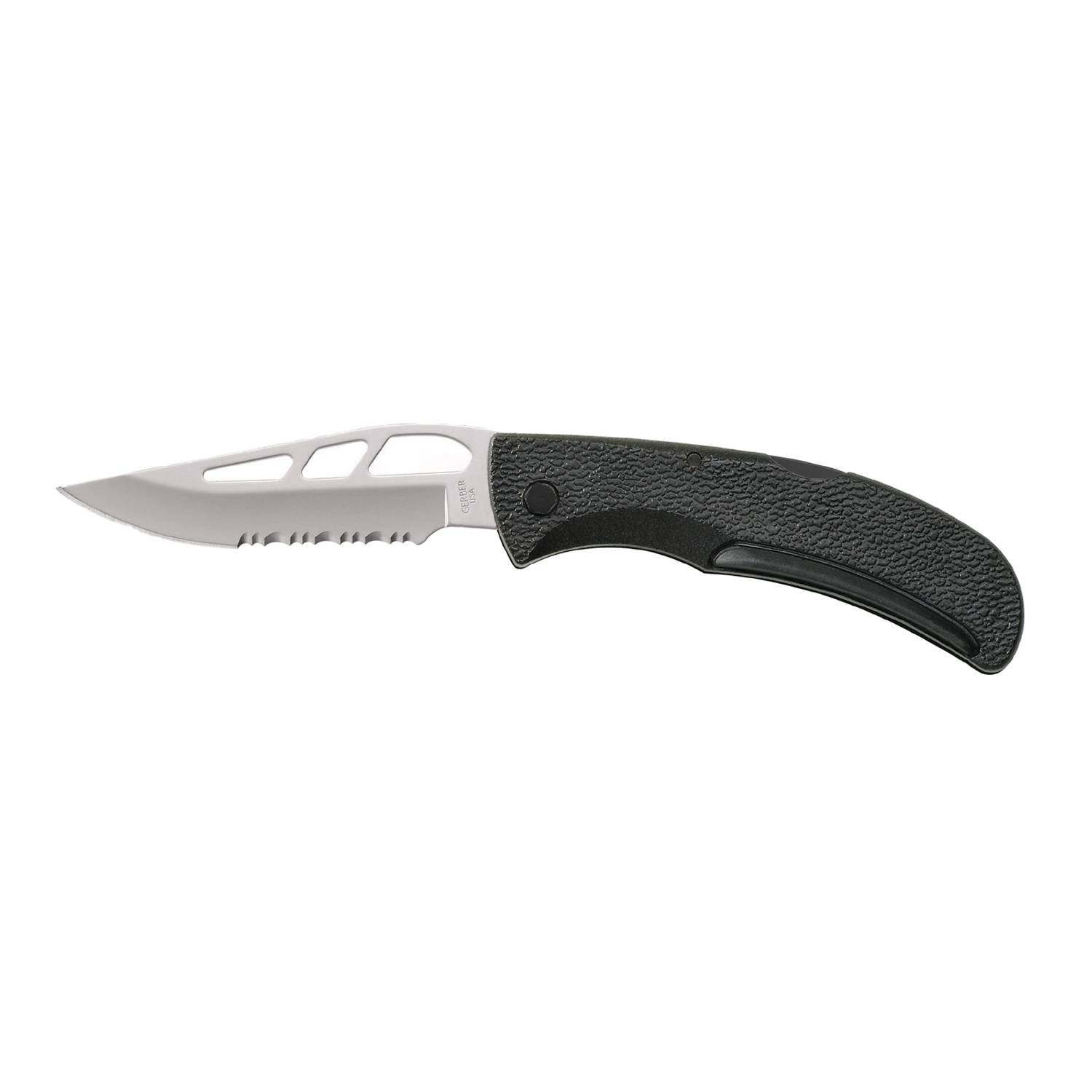 The Gerber E-Z Out Skeleton Serrated Knife is an all-purpose tool with a sharp stainless steel blade. This EDC knife is easy to deploy with one hand and features a rugged polycarbonate handle with SoftGrip inserts for a superior grip. There is also a sturdy pocket clip, making it easy to carry this tactical pocket knife wherever you go.