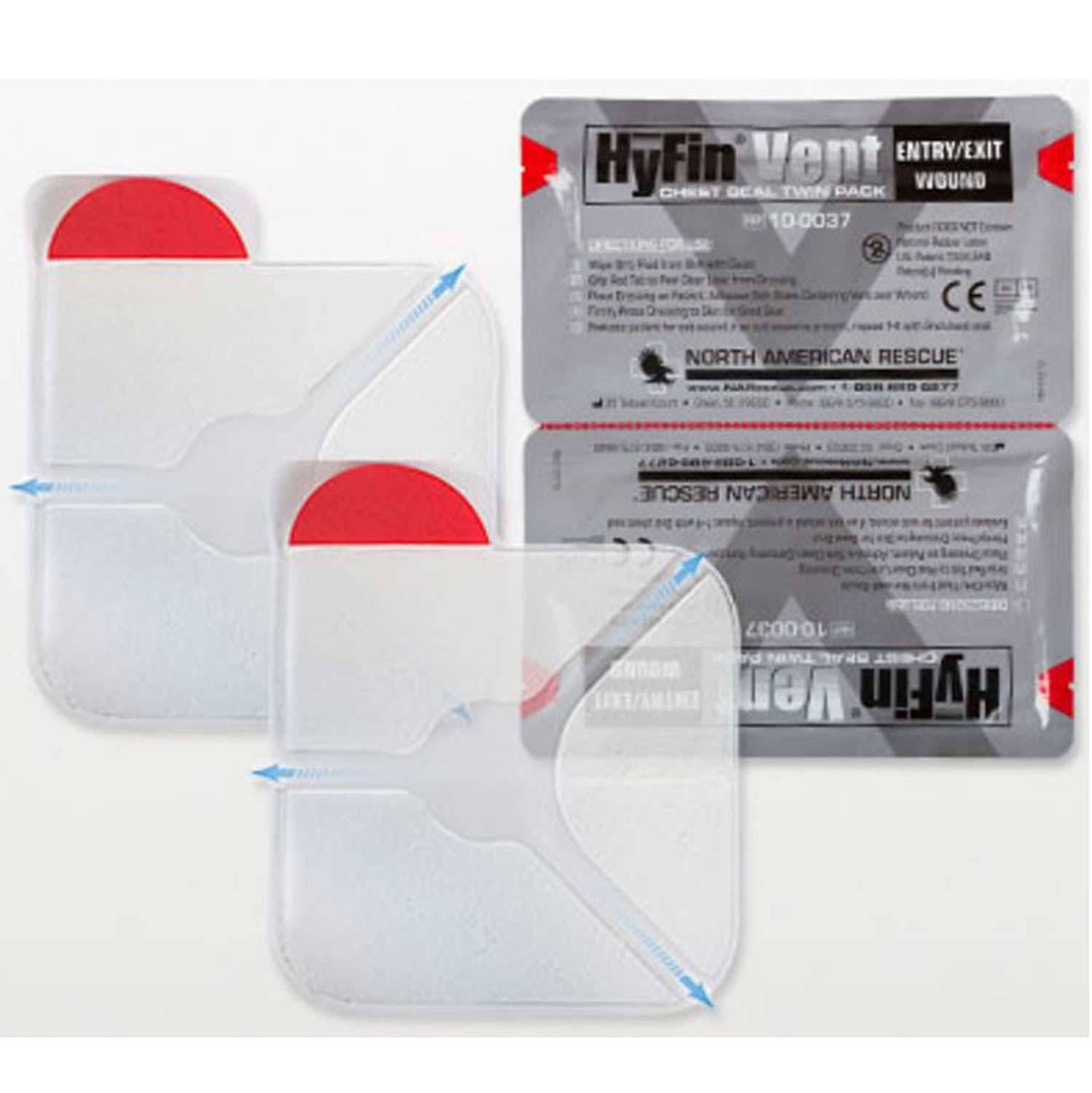 The North American Rescue Hyfin Vent Chest Seal (Twin Pack) provides rescues with a way to prevent, manage, and treat an open wound and/or tension pneumothorax potentially caused by penetrating chest trauma. This kit includes two individually packaged seals that can be applied to both an entry and an exit wound. There are 3 vented channels that prevent air from entering the chest cavity during inhalation. During exhalation, these channels will allow air to escape.