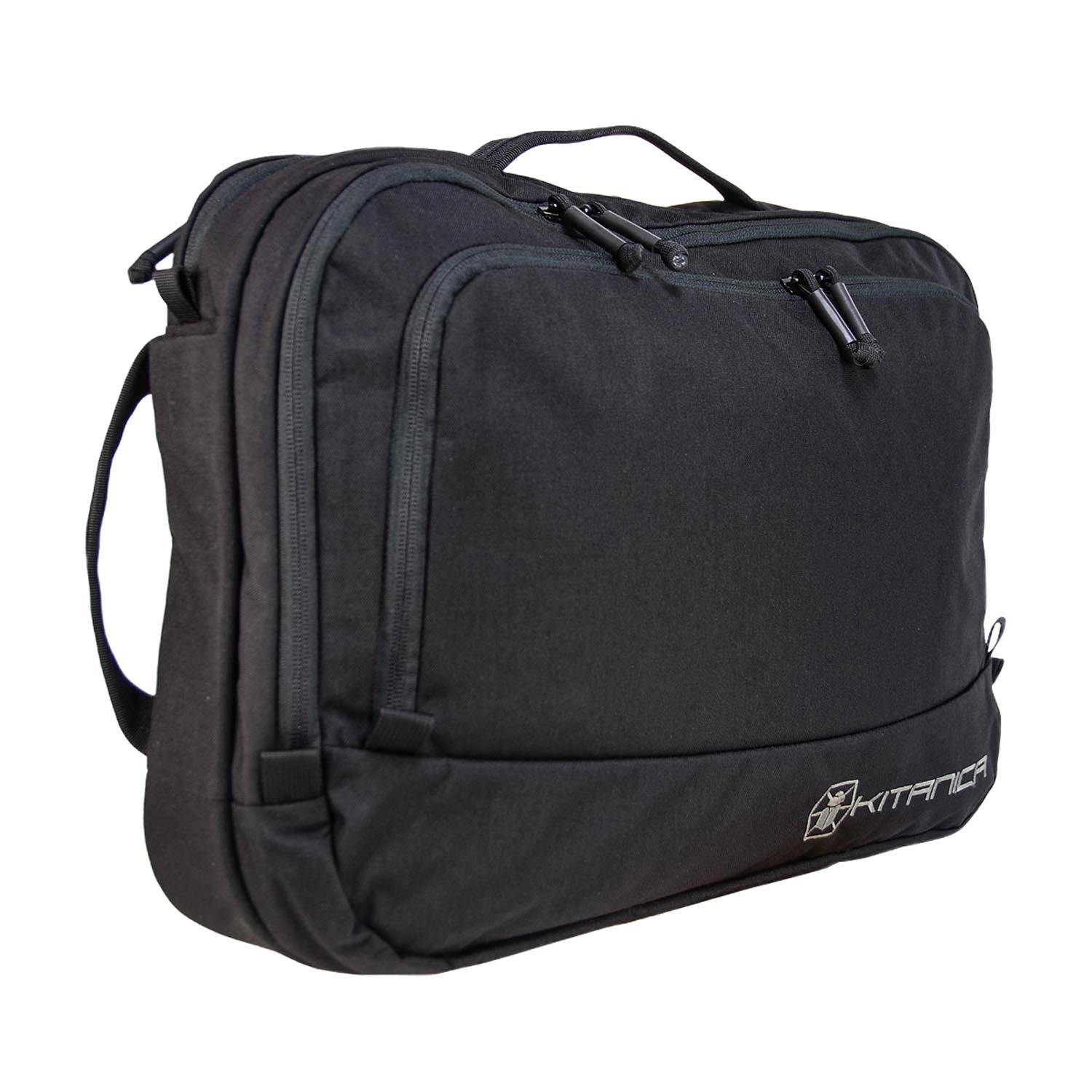 Kitanica’s Envoy attaché features a three-compartment design to organize and protect your business essentials. The electronics compartment has armored sleeves to protect a laptop and a tablet with 6 lb closed cell foam on all four sides. Two expandable interior mesh pockets organize your cables and accessories. Multiple carry options for maximum versatility. The top triple layer webbing handle carries as a traditional attaché and stowed in the back panel of the bag are shoulder straps. Made with 3/8” foam and spacer mesh they feature perfect contouring and a sternum strap for an extremely comfortable pack carry. An additional handle on the side allows you to pick it up along its short dimension, perfect for handling with straps deployed. Buckles in the end panels attach the shoulder strap for easy carry that allows access to contents.