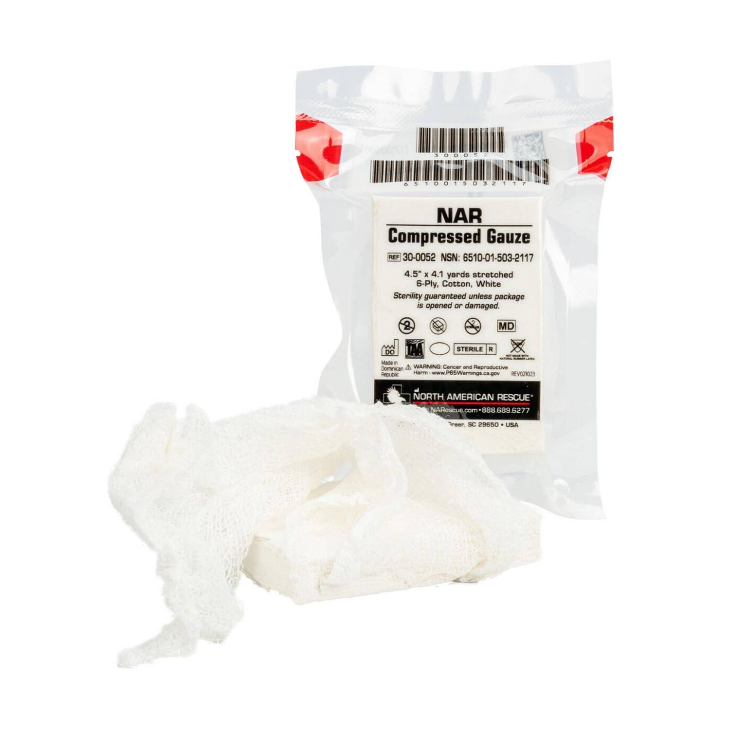 North American Rescue’s Compressed Gauze, measuring 4.5” x 4.1 yd, is a high-quality, sterile 6-ply 100% cotton gauze with excellent fluid absorption. A unique crinkle weave provides superior absorption and is indicated for the treatment of bleeding, wound bandaging, and dressing. Ultra-compact and easy to store, this gauze is suitable for controlling hemorrhage, backing gauze for hemostatic agents, or wound bandaging.