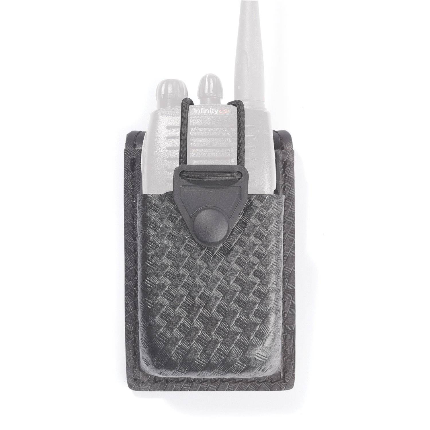 The Model 761 Adjustable Radio Holder is designed with a protective pouch and an adjustable bungee cord tie-down with a snap closure to keep standard portable police radios secure. Constructed of durable SafariLaminate material, this holder is designed for 2.25 in. duty belts.