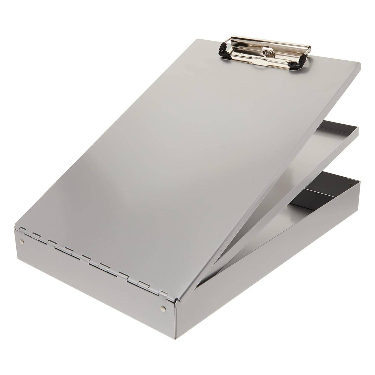 The Saunders Cruisermate Aluminum Storage Clipboard is a portable office with its top-opening design and high-capacity clip. It helps you stay organized on the go, thanks to two storage compartments that conveniently hold your forms, office supplies, and accessories. The top compartment accommodates up to a 7/16" stack of paper, and the nearly 1" deep lower tray safeguards everything from tablets and smartphones to keys and more. Additionally, it offers a pen tray for easy access to your smaller essentials. Made of recycled aluminum, this clipboard with storage is designed to withstand regular use and provide years of organizational convenience. It is TAA compliant and securely holds up to a 1" stack of paper.