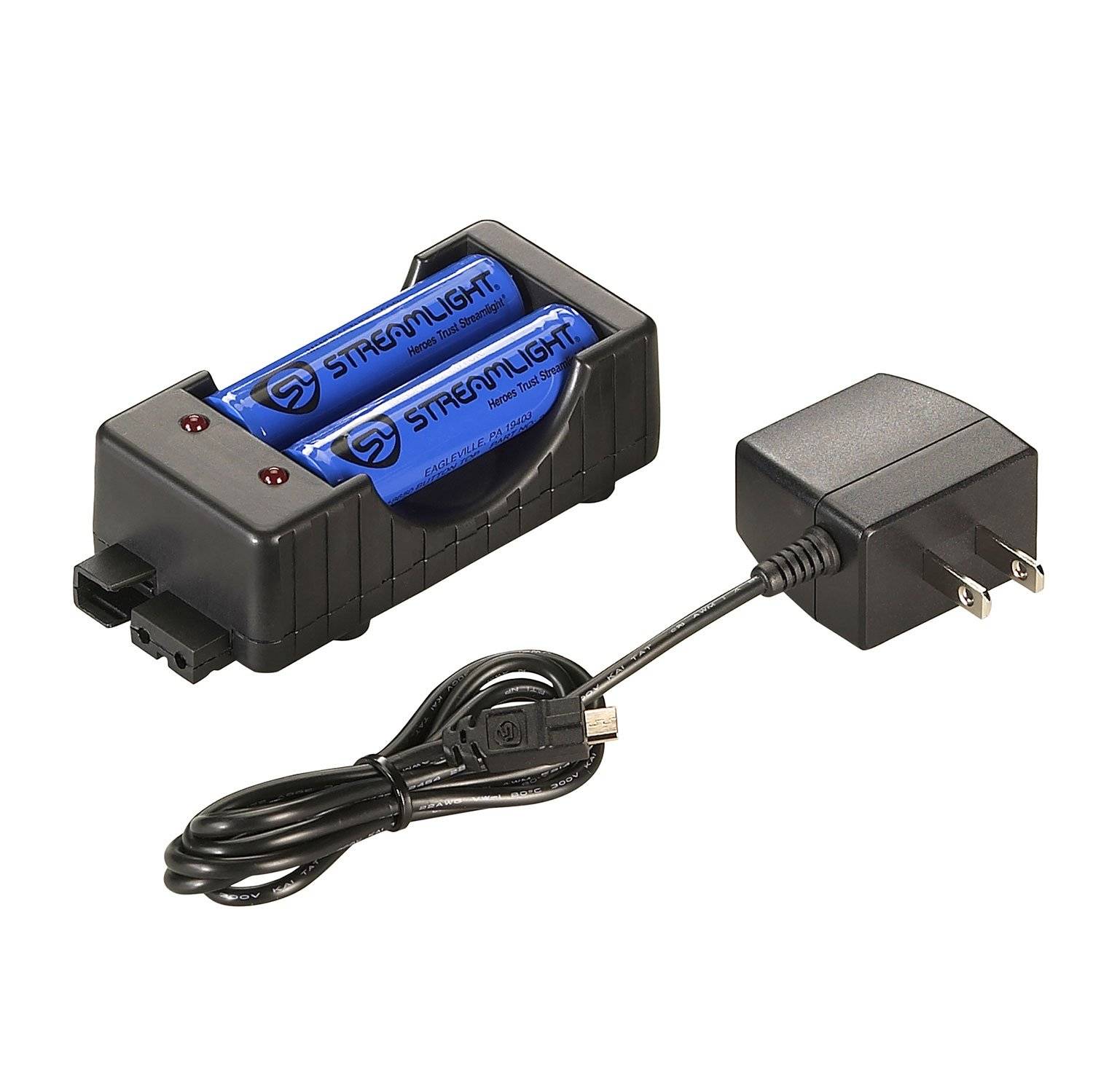 Charge your batteries - one or two at a time - in the dual input charging cradle. Uses either USB or "traditional" AC/DC power sources for a wide variety of battery charging options. Includes two 18650 batteries and 120V AC wall adapter.