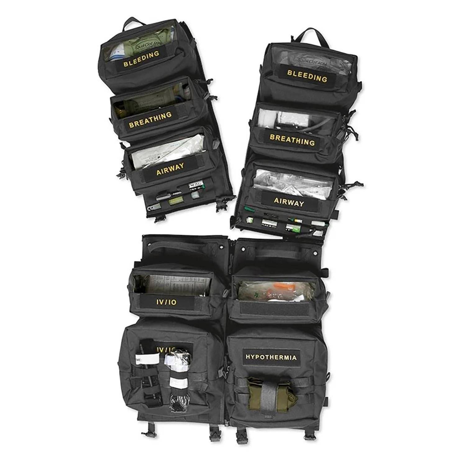 The Tasmanian Tiger Medic Transporter provides a highly efficient solution for organizing and transporting your essential medical supplies. It features a sizable panel that divides into four smaller panels. This panel is made of durable CORDURA 700 Denier and 420 HD Nylon. Pouches attached to the panel, including a dump pouch and several transparent pouches, provide ample space for all your gear and are detachable for greater versatility. Also included are labels for various medical application categories, offering easy identification for quick access during emergencies. Please note that medical supplies are not included.