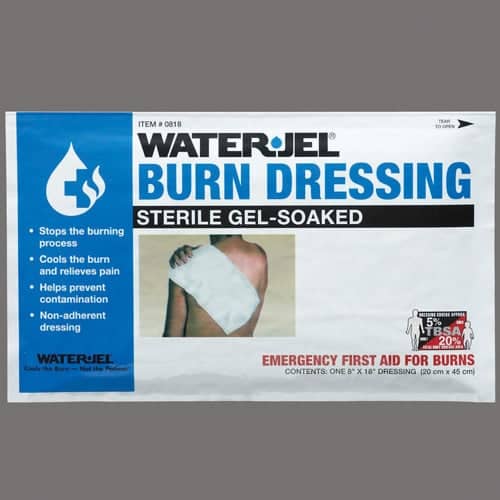 Water-Jel® Sterile Burn Dressings are easy to carry and easy to use. These sterile, patented, gel-soaked burn dressings come in a variety of sizes to accommodate a variety of emergency situations. When applied to the wound, they cool the burn, relieve the pain and protect against airborne contamination. Water based and water soluble, these dressings can be easily removed without re-injuring the wound. This Water-Jel Sterile Burn Dressing measures 8" x 18".